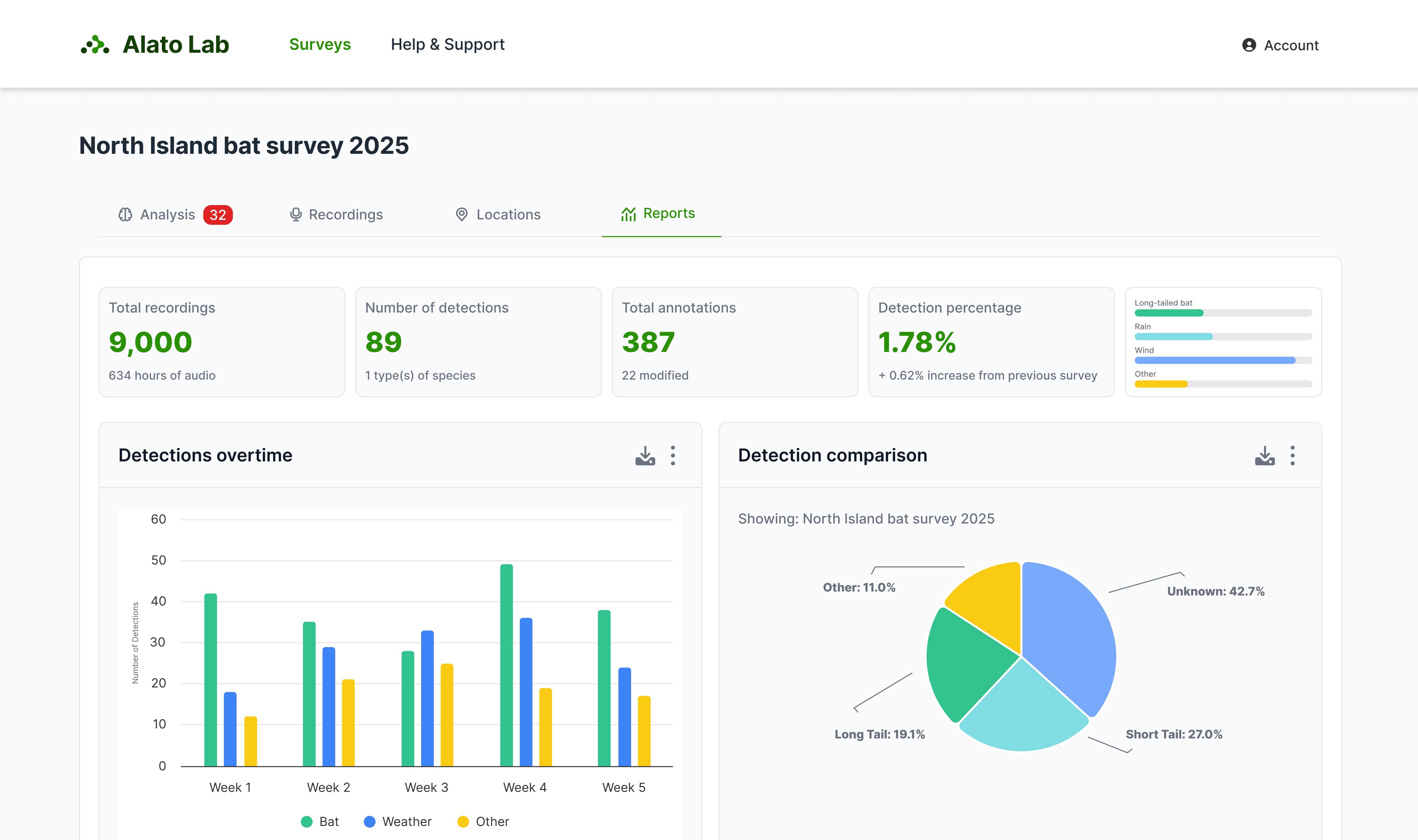 Alato Labs automates BMP analysis for NZ bat monitoring. Our AI-powered platform automatically detects longtail and shortail bats giving you detection reports in minutes.